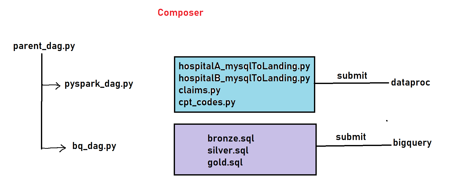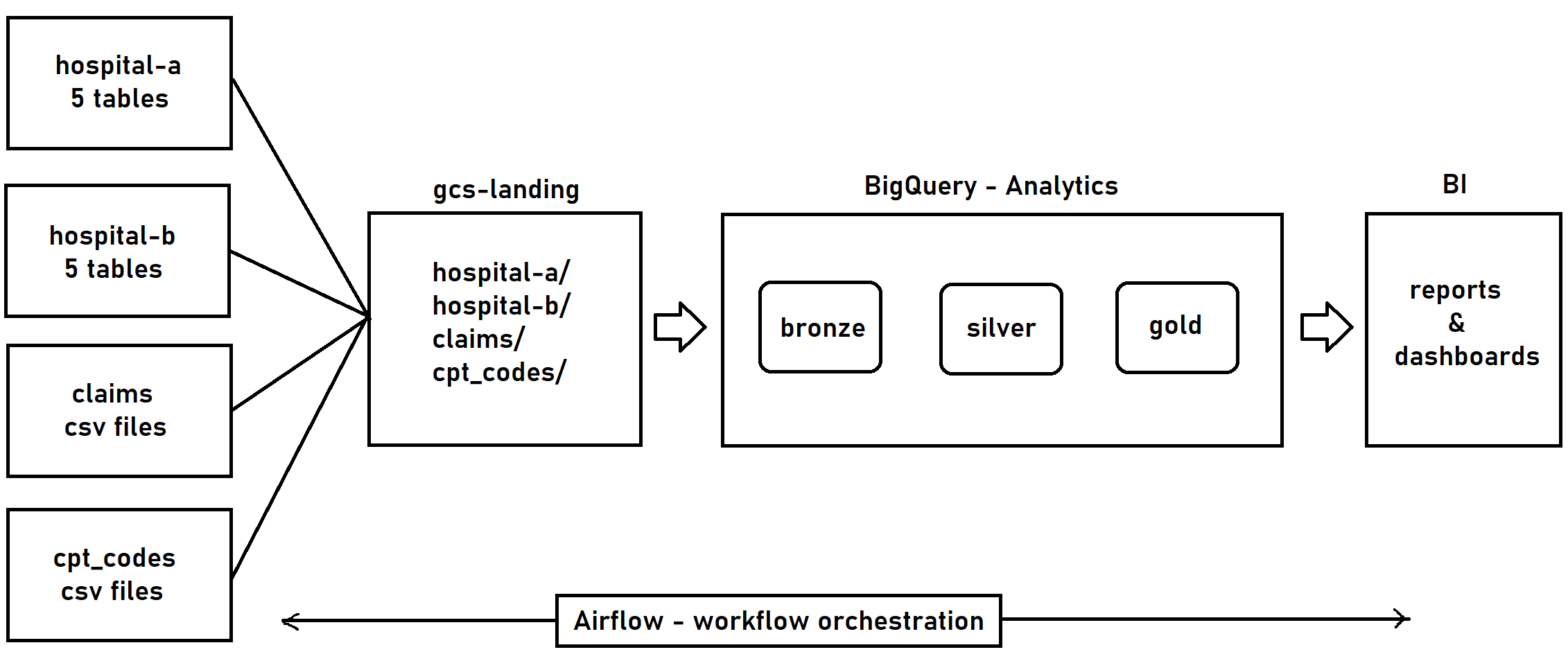 - Extract: PySpark jobs for EMR data, flat file ingestion for claims, API calls for CPT/NPI/ICD.